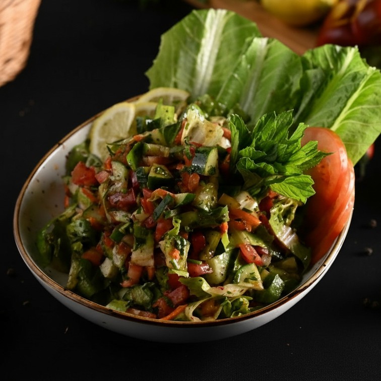 خليط من الطماطم والخيار والبصل مع عصرة ليمون ولمسة زيت زيتون.
