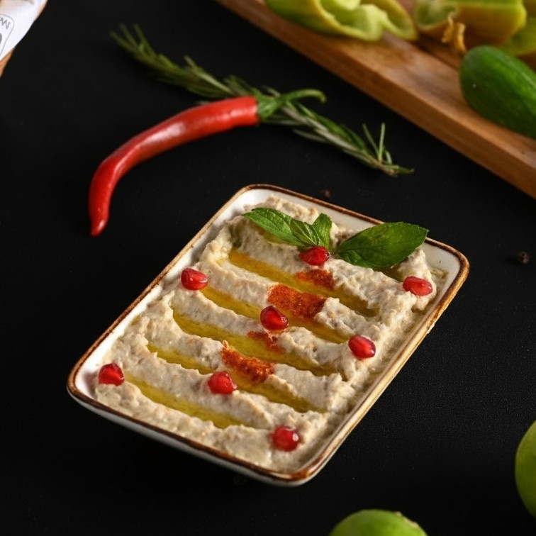 باذنجان مشوي مهروس مع طحينة وثوم ولمسة ليمون بطعم مدخّن مميز.