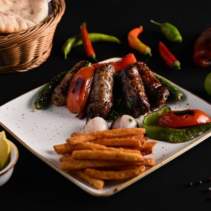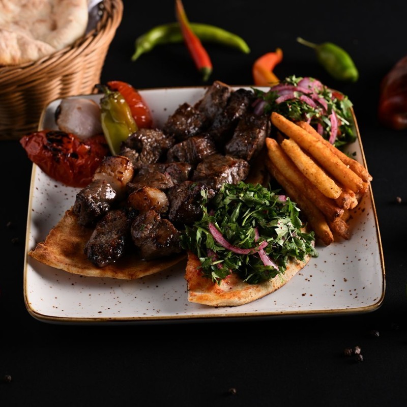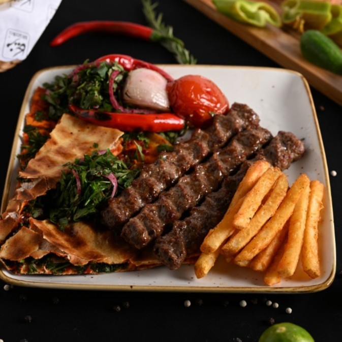 كباب لحم بقري مشوي على الفحم بطعم غني، يُقدَّم مع سلطة، طحينة، عيش و50 جرام بطاطس.