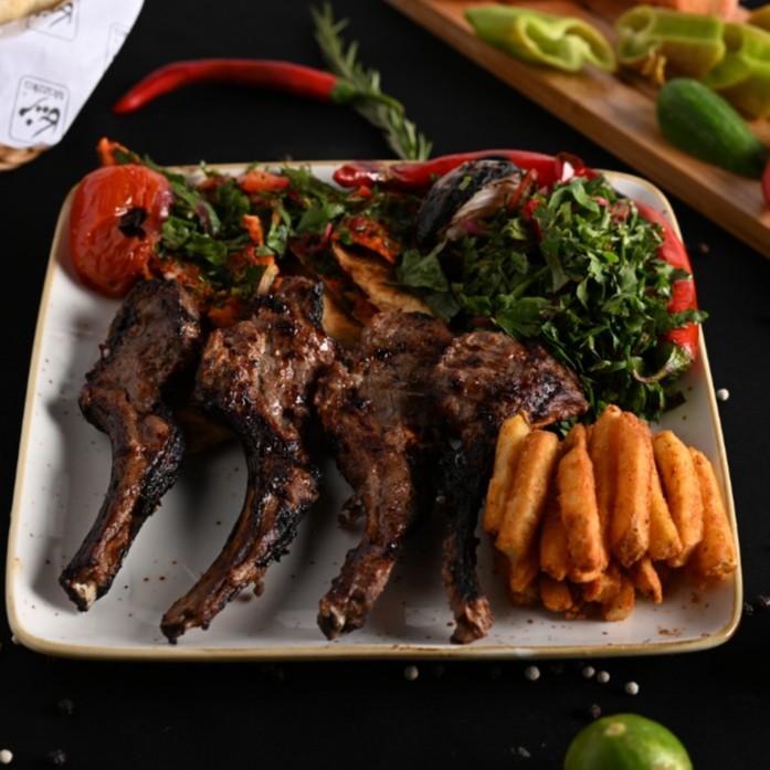 ريش ضاني مشوية بعناية، طرية وغنية بالنكهة، تُقدَّم مع سلطة، طحينة، عيش و50 جرام بطاطس.