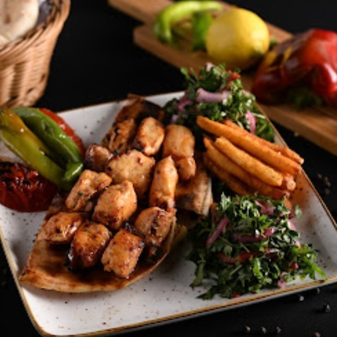 مكعبات صدور فراخ متبلة ومشوية على الفحم، تُقدَّم مع سلطة، طحينة، عيش و50 جرام بطاطس.