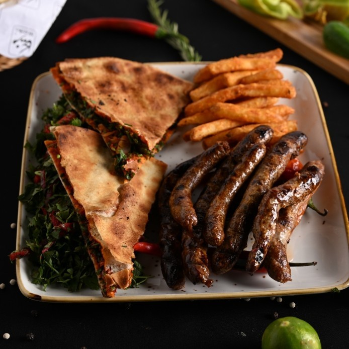 سجق بلدي متبل ومشوي على الفحم، يُقدَّم مع سلطة، طحينة، عيش و50 جرام بطاطس.