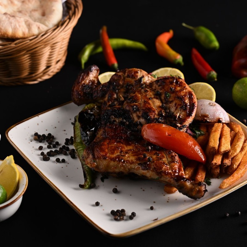 فراخ متبلة ومشوية على الفحم بطعم شهي، تُقدَّم مع سلطة، طحينة، عيش و50 جرام بطاطس.